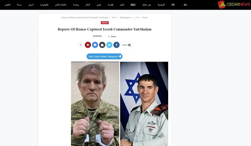 Пропагандисты ХАМАСа утверждают, что взяли в плен полковника ЦАХАЛа Яир Шалама, опубликовали якобы его фотографию..«Радостная» новость широко разошлась по палестинским и арабоязычным пабликам. Публиковалось и фото «пленного офицера». Пропагандисты ХАМАСа даже сравнивали его с фото Герци Халеви, начальника генштаба ЦАХАЛа, намекая, что это один и тот же человек. И, mama mio, получился конфуз: «пленным» оказался небезызвестный кум Путина, экс- депутат Украины Виктор Медведчук