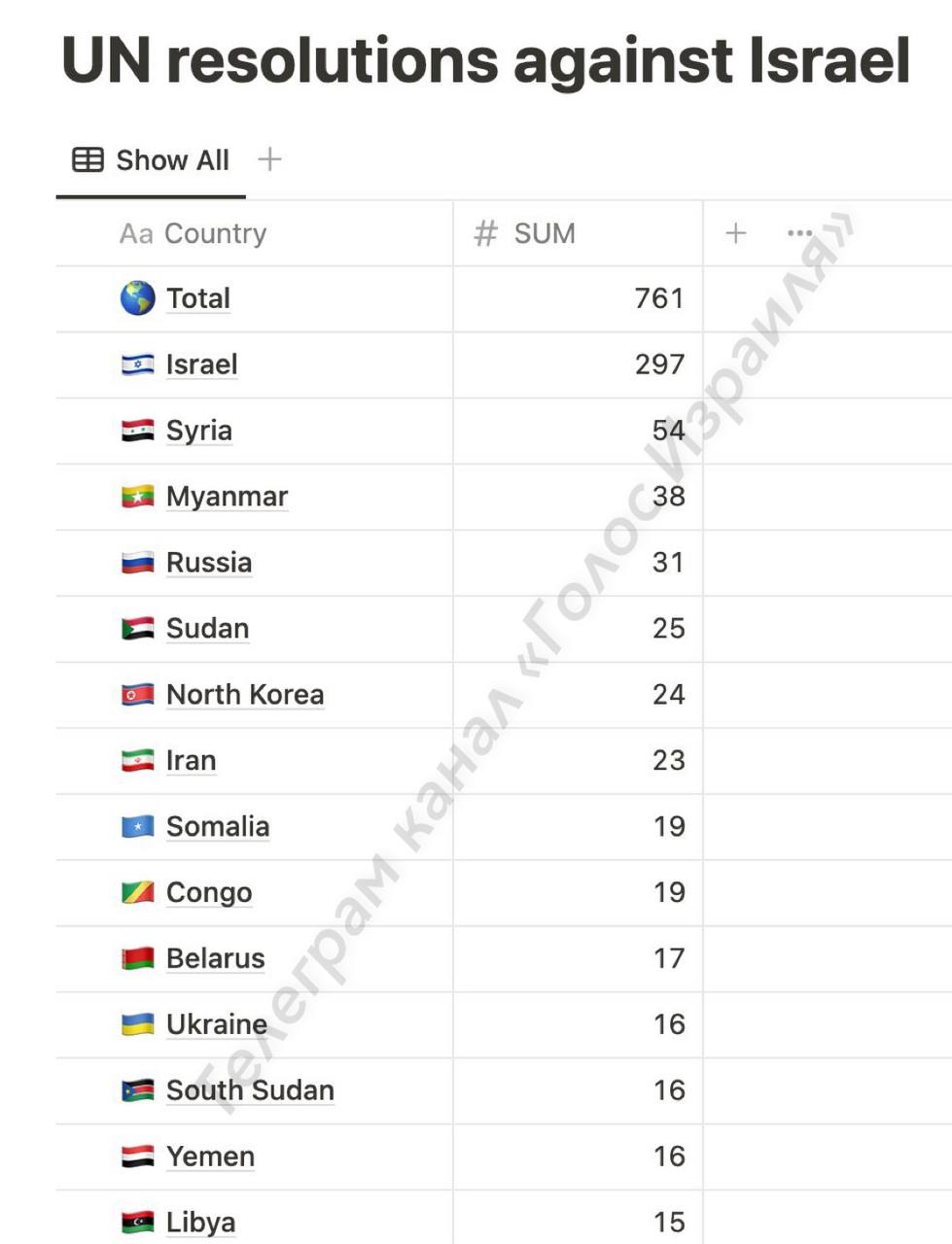 Интересную статистику представил интернет-канал «Голос Израиля». Оказывается, что начиная с 2006 года 40% всех резолюций ООН направлены против одной страны — Израиль. В цифрах это выражается так: 297 из 761.