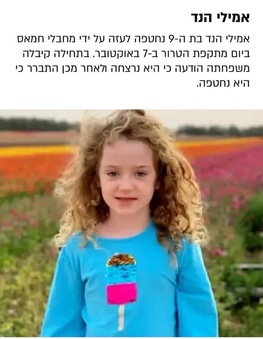 Эмили Хэнд, 9 лет, еще одна из освобожденных, вернулась к своей семье, которой первоначально сообщили, что она была убита 7 октября. Большинство освобожденных в субботу израильских заложников — из кибуца Беэри.