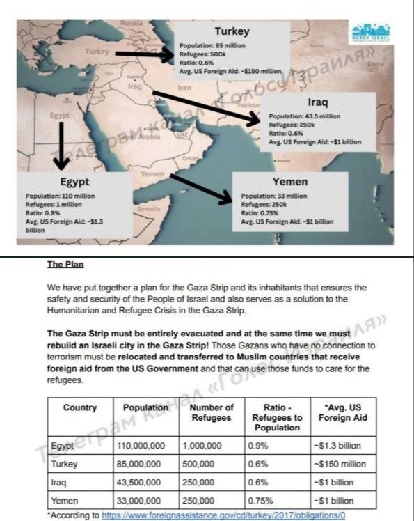 Согласно инициативе, выделение американской помощи арабским странам продолжится только при условии, что они примут 2 млн беженцев из сектора Газа:«Израиль просит избежать причинения вреда гражданскому населению в Газе, но ХАМАС не позволяет беженцам покинуть Газу, а Египет не соглашается открыть свои границы. Единственное моральное решение — обеспечить, чтобы Египет открыл свои границы и позволил беженцам выйти из-под контроля диктатуры ХАМАСа»-сообщает телеграмм-канал «Голос Израиля».