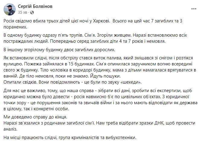 Дополнено в 7.00: известно о семи погибших в Харькове, среди них трое детей — 7 и 4 лет, а также младенец, сообщил руководитель полиции Харьковщины Владимир Тимошко.