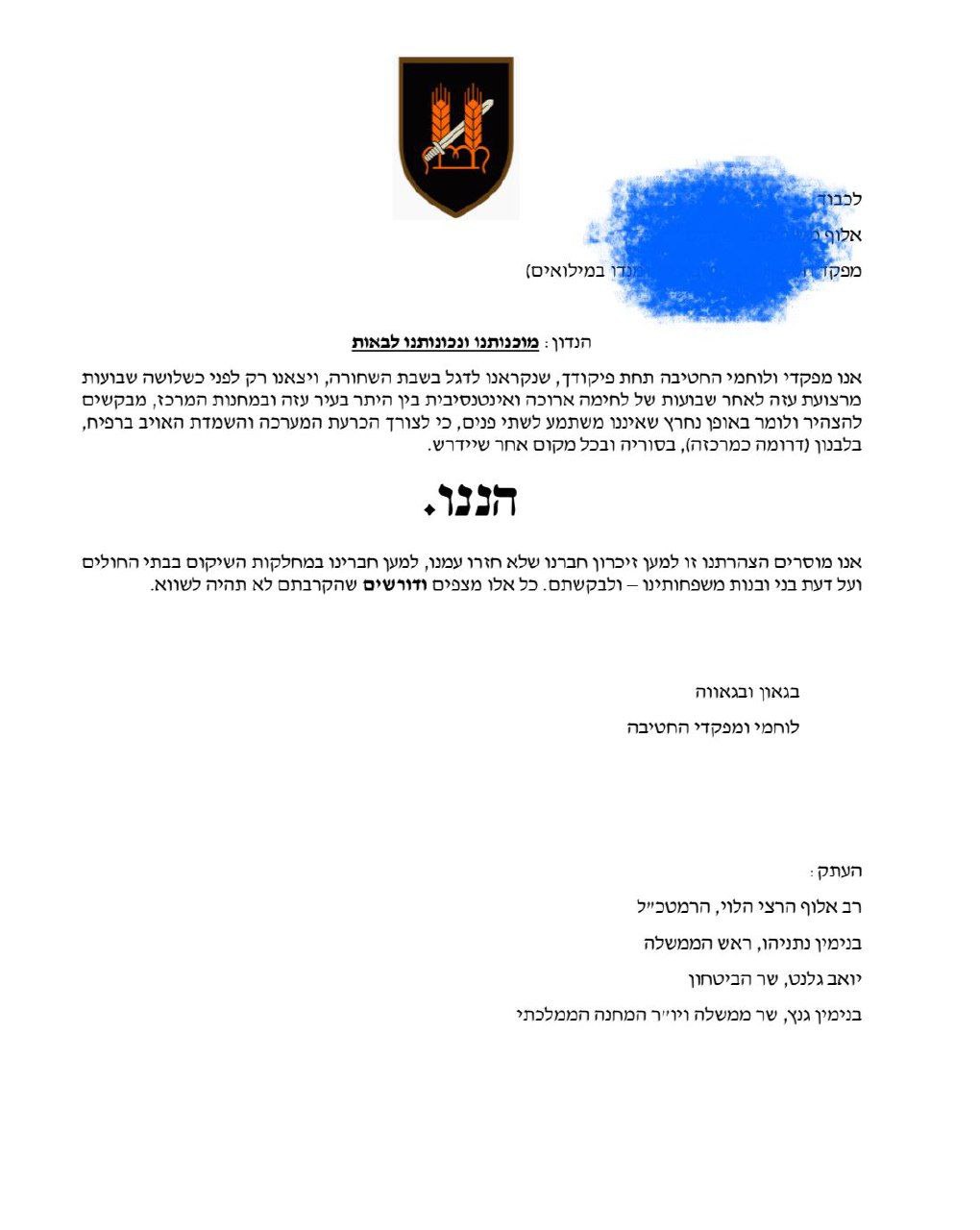 Мы, командиры и бойцы бригады под вашим командованием, которые были призваны к флагу в Черную субботу и всего три недели назад вышли из сектора Газы после долгих и интенсивных недель боев, в том числе в городе Газа и в центральных лагерях, хотим заявить и ясно выразить, без двусмысленности, что ради решающего разгрома врага в Рафахе, в Ливане (на юге как и в центре), в Сирии и в любом другом месте, где это потребуется, мы готовы!