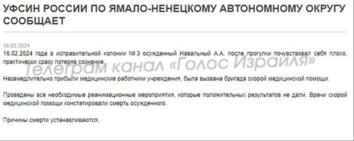 Официальное сообщение УФСИН России-Алексей Навальный умер в колонии.Согласно сообщениям в российских СМИ — после поездки в Ямло-Нанецкую область у Навального образовался тромб, после чего ему стало плохо и он потерял сознание.Для расследования обстоятельств его смерти создана комиссия из руководителей и сотрудников оперативно-медицинских частей Федеральной службы исполнения наказаний России.
