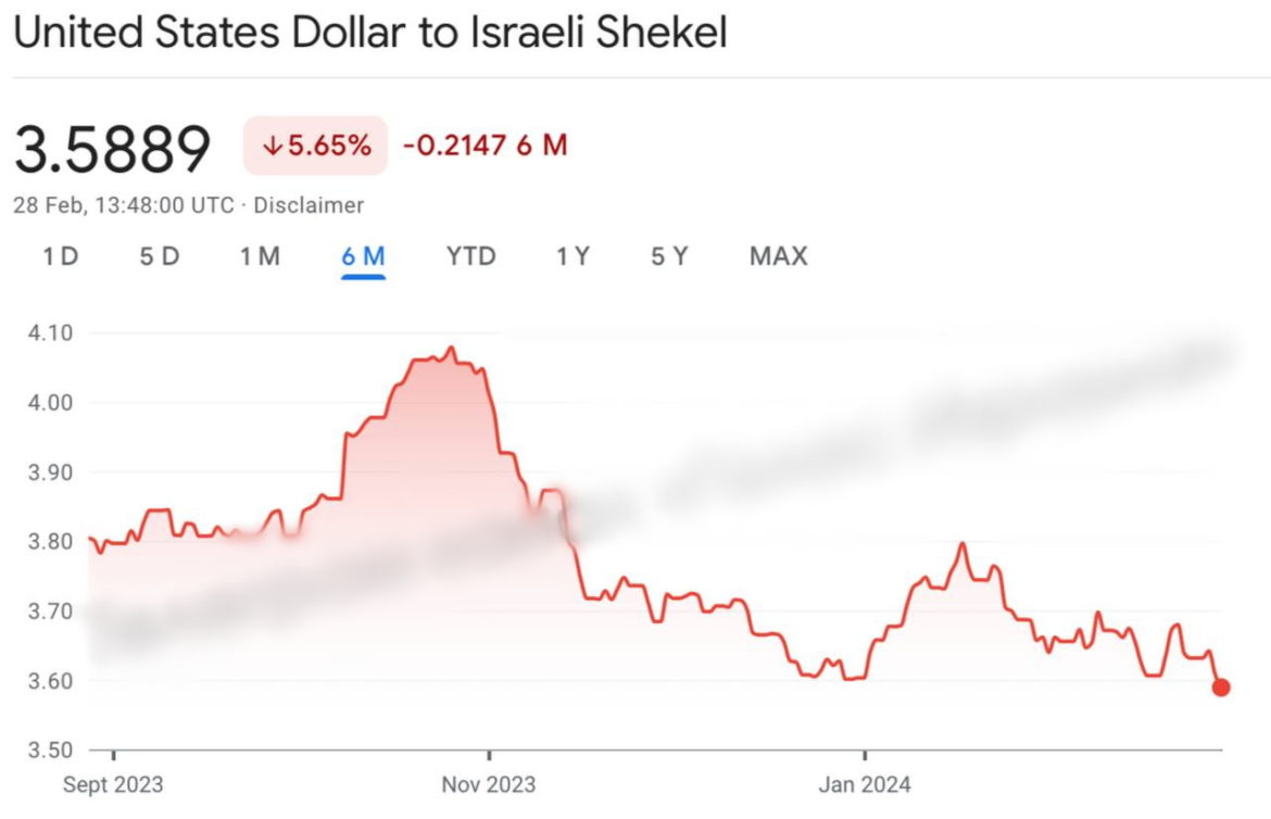 Израильский шекель продолжает укрепляться по отношению ко всем валютам, а доллар впервые с июля 2023 года опустился до 3,58 шекеля. Шекель снова стал самой сильной валютой в мире.