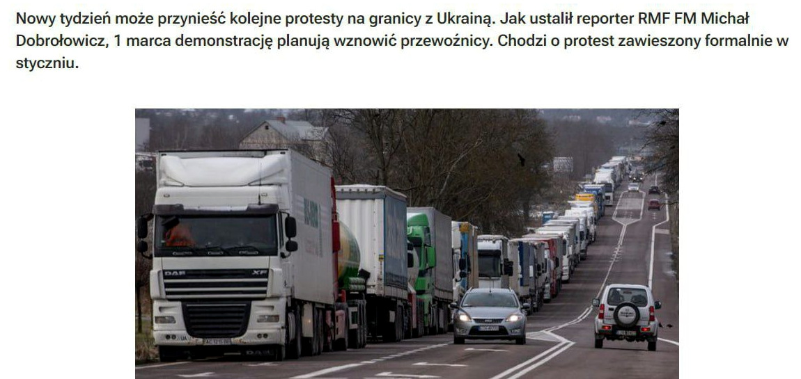 Ранее сообщалось, что 20 февраля протестующие начали более жесткое ограничение движения транспорта на границе с Украиной. Грузовики блокировали на КПП Медика — Шегини, Долгобичув — Угринов, Зосин — Устилуг, Корчева — Краковец, Гребенное — Рава-Русская и Дорогуск — Ягодин.