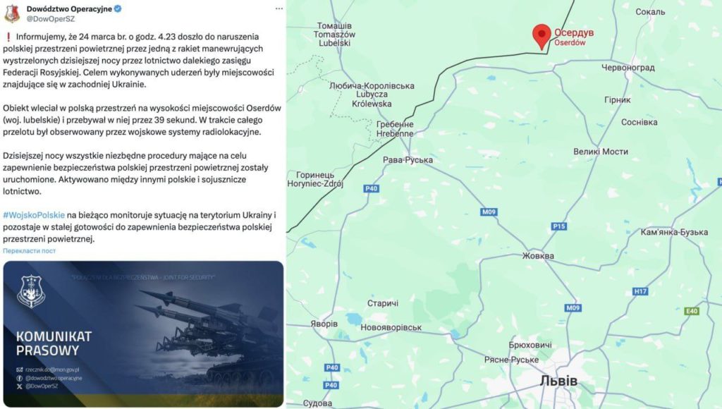 После этого улетела на Львов, сообщило Минобороны страны. Ее маршрут якобы отслеживали и «приняли необходимые меры по защите»:»Объект влетел в польское пространство в районе деревни Осердув (Люблинское воеводство) и оставался там в течение 39 секунд. В течение всего полета он наблюдался военными радиолокационными системами», — сообщает польская сторона.