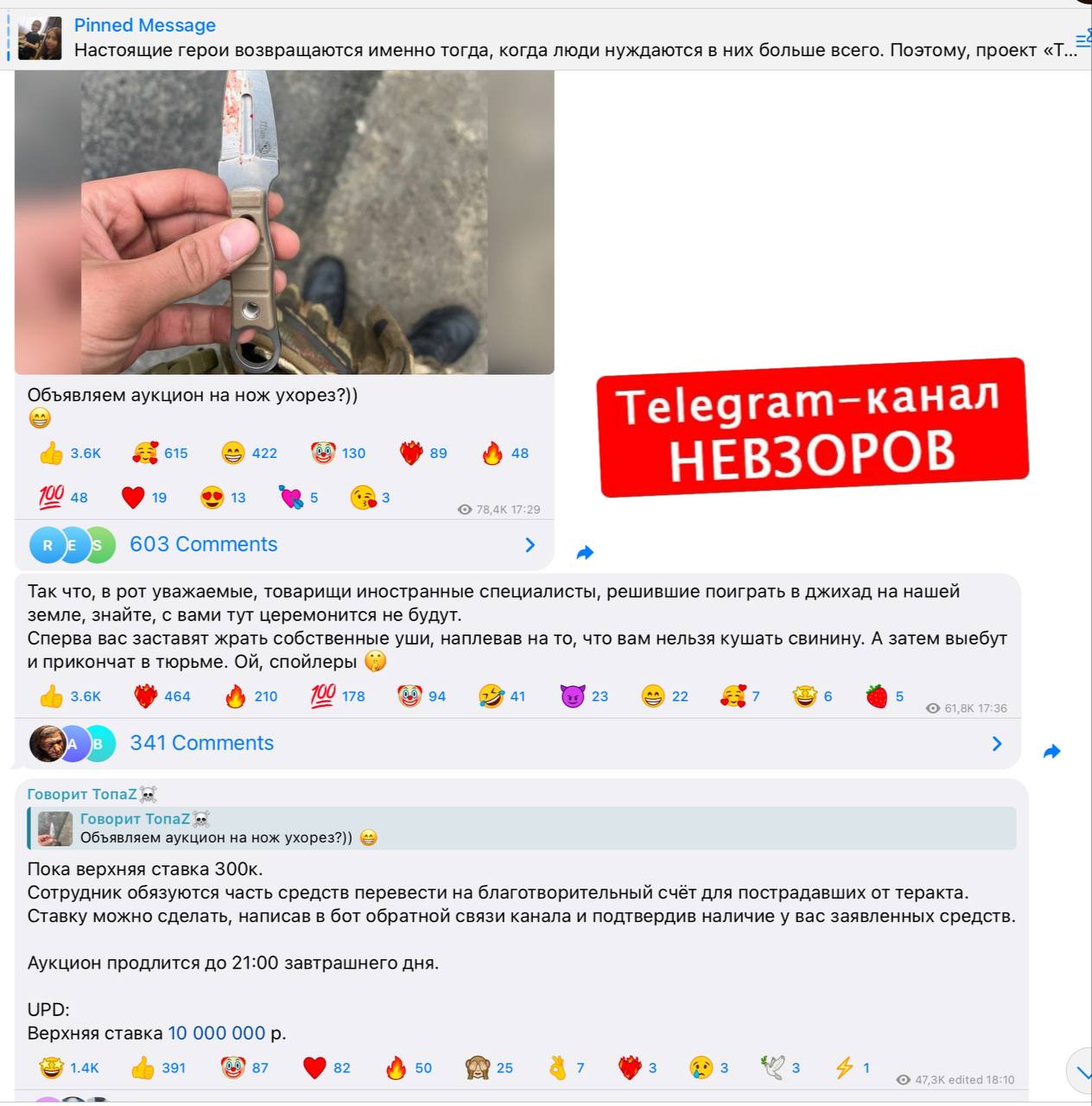 За окровавленный нож, которым отрезали ухо предполагаемому террористу таджикской национальности, дают уже 300 тыс. Хотят 10 миллионов.Об этом сообщает телеграм канал Невзоров: