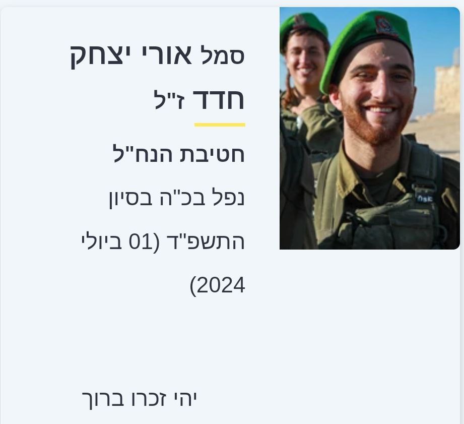 Сержант Ори Ицхак Хадад, 21 год, из Беэр-Шевы, боец 931-го батальона бригады Нахаль, погиб в бою на юге сектора Газа.