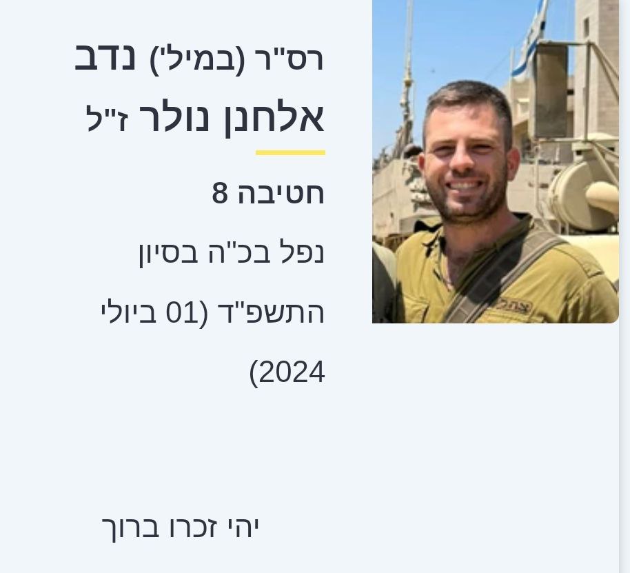 Старшина (в запасе) Надав Эльханан Кноллер, 30 лет, уроженец Иерусалима, сержант взвода 121-го батальона 8-й бригады, погиб в бою в центре сектора Газа.