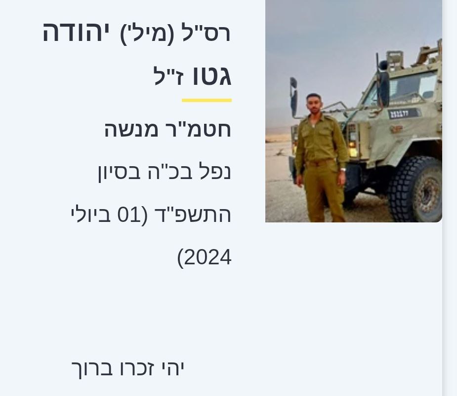 Старшина (в запасе) Иегуда Гето, 22 года, из Пардес Хана-Каркур, оперативный водитель, погиб во время оперативных действий в районе бригады Менаше.