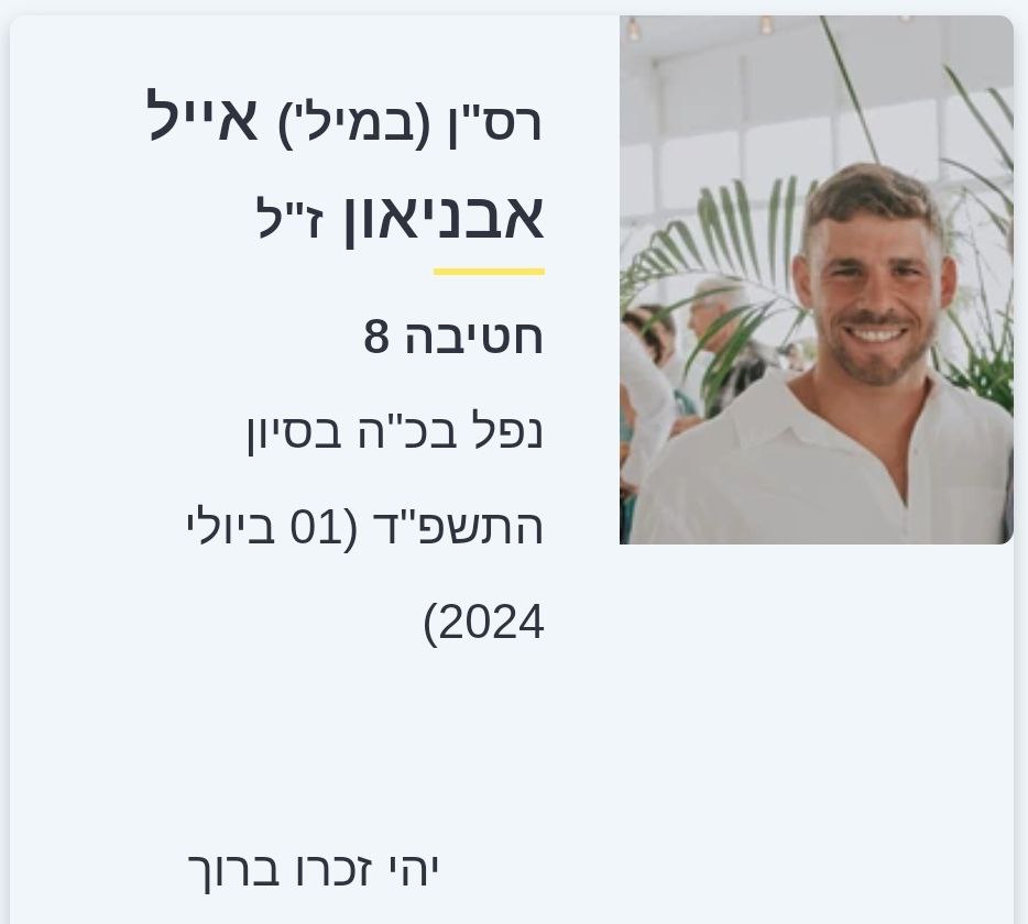 Майор (в зарасе) Эяль Авнион, 25 лет, из Ход ха-Шарона, заместитель командира роты 121-го батальона 8-й бригады, погиб в бою в центре сектора Газа.