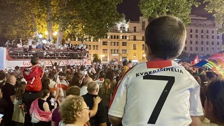 Вечером футболисты собрались уже на стадионе имени Михаила Месхи в Тбилиси. Это стадион, где была организована прямая трансляция матчей для грузинских болельщиков. Отсюда на открытом автобусе,через толпы приветствующих по пути болельщиков, футболисты проехали к площади Свободы, где для церемонии их встречи соорудили сцену с подсветкой.