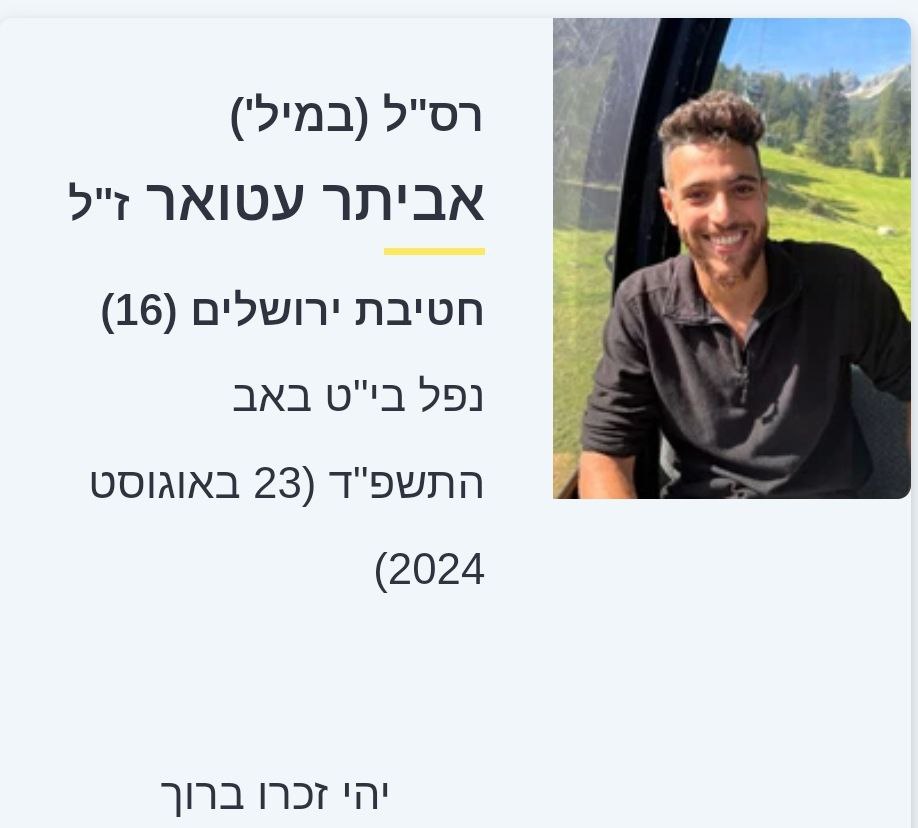 Старшина (в запасе) Эвьятар Атуар, 24 года, из Рош Ха-айн, боец 6310-й бригады, пал в бою в центре сектора Газа.