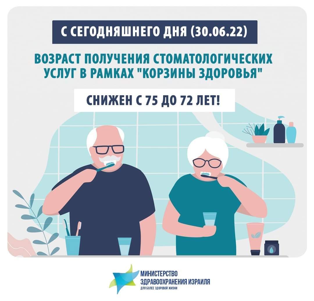 30 июня министерство Израиля сообщило, что возраст, дающий право на профилактическую, поддерживающую и восстановительную стоматологическую помощь в рамках корзины медицинских услуг, снижен с 75 до 72 лет.