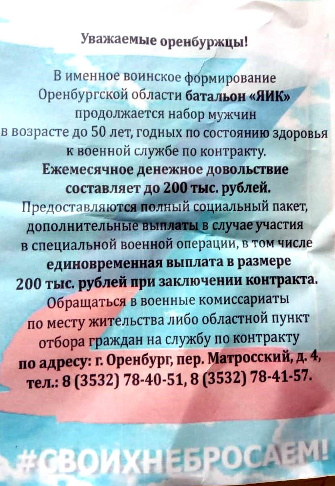И, хотя, Президент России Владимир Путин первоначально заявил, что ни один призывник не был задействован в войне, обращения матерей погибших и «пропавших безвести» срочников РА говорят об обратном.Вслед за Путиным и министерство обороны признало, что «некоторые призывники были отозваны с фронта после их отправки по ошибке». Кремль заявил, что всеобщей мобилизации в России не будет, возможно, опасаясь, что такая политика окажется непопулярной. Но как говорится — одно дело говорить, другое- делать. По всей великой( великой- в смысле -большой), России, в больших и малых городах и весях можно обнаружить в почтовом ящике «ненавязчивые» приглашения для мужчин до 50 лет. В Мордовии и на Урале, на средней Волге и Ростове предлагают повоевать за Россию в Украине.И не даром, а за льготы и большие деньги.Впрочем, читайте сами: это «приглашение» оренбуржцам.