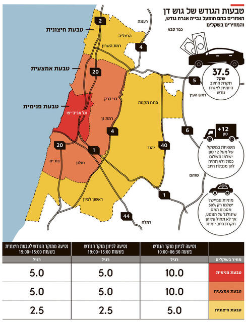 В случае ее реализации, примерно через два года, реформа разделит Гуш-Дан (агломерацию Тель-Авив) на три кольца. При пересечении каждого из них с водителей и владельцев транспортных средств будут взимать налог, фактически являющийся сбором за пробки.