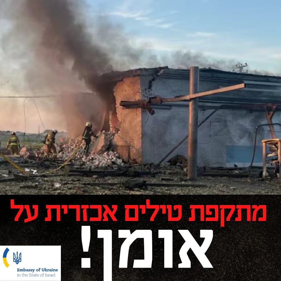В посольстве Украины в Израиле рассказали, что вечером 8 июня армия РФ нанесла ракетный удар по Уманскому району (Черкасская область, Украина).Об этом сообщили в пресс-службе дипломатического ведомства.Согласно предварительной информации, десять человек получили ранения, пострадали гражданские объекты в этом районе. «С начала войны российский враг не делает различий между нападением на солдат и жестоким нападением на гражданское население. Целью являются даже места религиозного значения. Мы знаем, насколько важна Умань для евреев, и ожидаем значительной помощи от правительства Израиля», – заявил посол Украины в Израиле Евгений Корнийчук.
